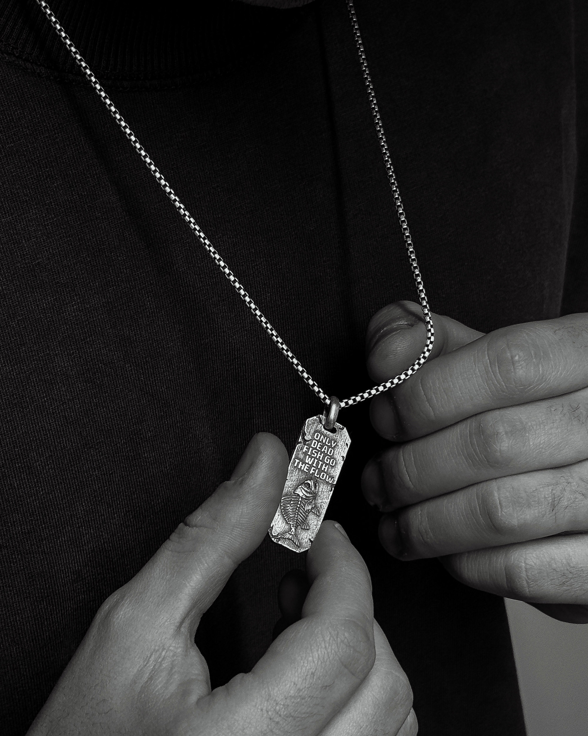 AGAINST THE FLOW (aus dem Englischen — „gegen den Strom“) ist ein Silberanhänger mit der Gravur “ONLY DEAD FISH GO WITH THE FLOW” — „Nur tote Fische schwimmen mit dem Strom.“