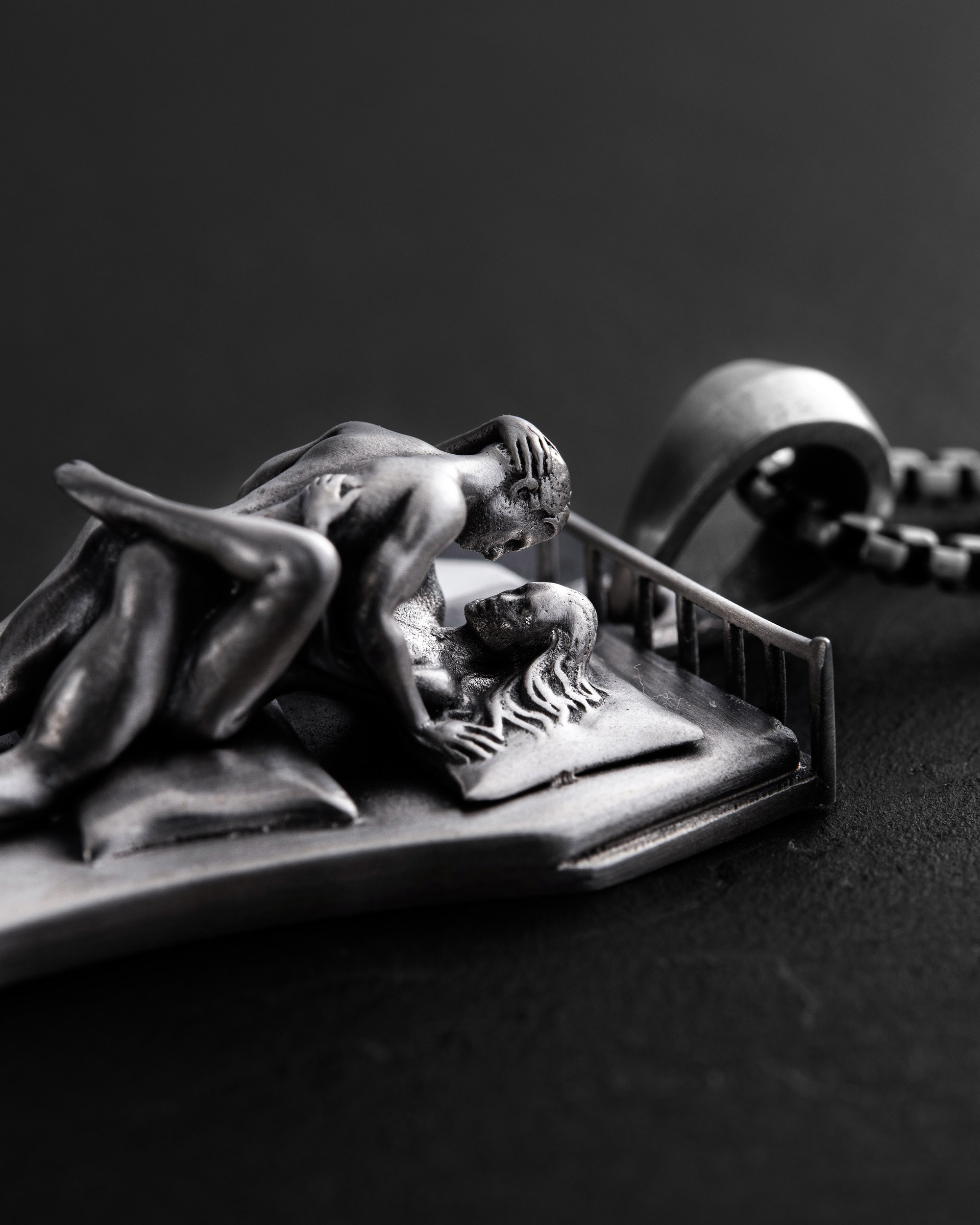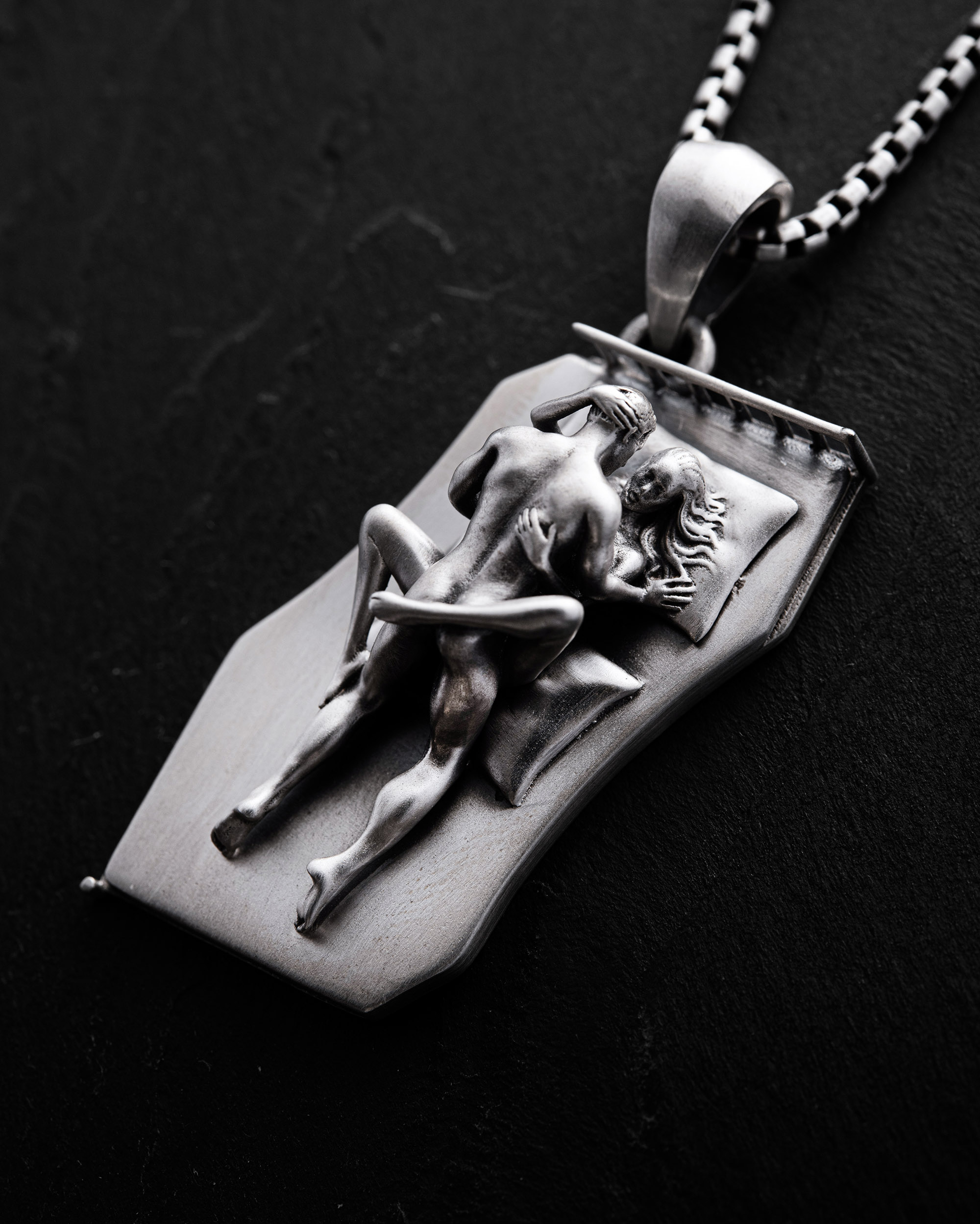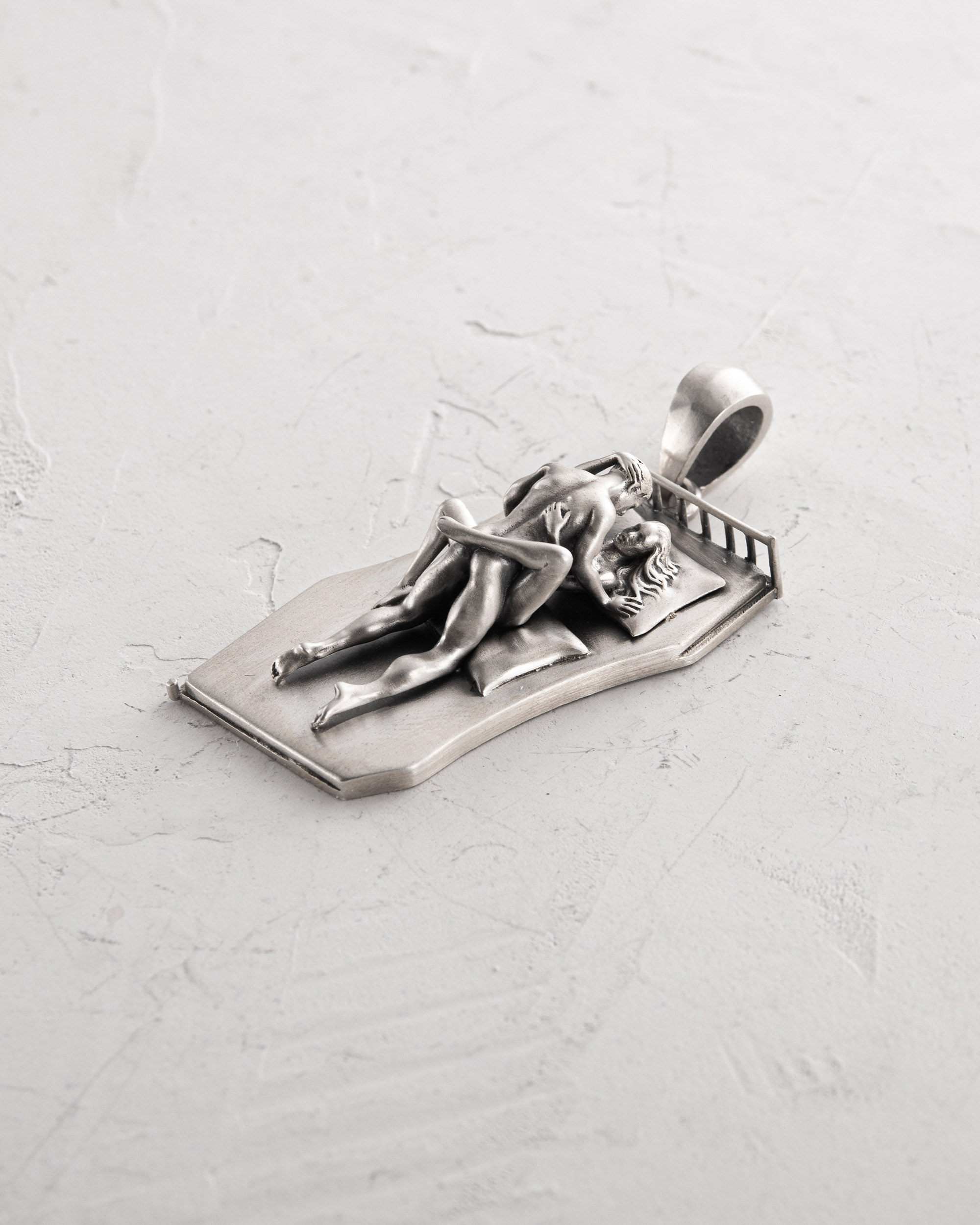 IN BED (Im Bett) — ein silberner Anhänger, der Leidenschaft, Ehrlichkeit und tiefe Intimität zwischen zwei Menschen verkörpert. Sein Motiv zeigt den Moment der Vereinigung – wenn Körper eine Sprache sprechen, die nur zwei verstehen, und Gefühle auf ihr Wesen reduziert werden. Es ist eine Geschichte über Vertrauen, gegenseitige Energie und Offenheit, frei von Rollen und Masken. IN BED symbolisiert nicht nur körperliche Nähe, sondern einen Raum, in dem wahre Harmonie entsteht – zwischen Verlangen und Ruhe, Körper und Seele. Dieser Anhänger ist nicht nur über Sex, sondern über etwas viel Größeres: die Tiefe einer Verbindung, in der Leidenschaft zur Sprache des Vertrauens wird und eine Berührung mehr sagt als jedes Wort.