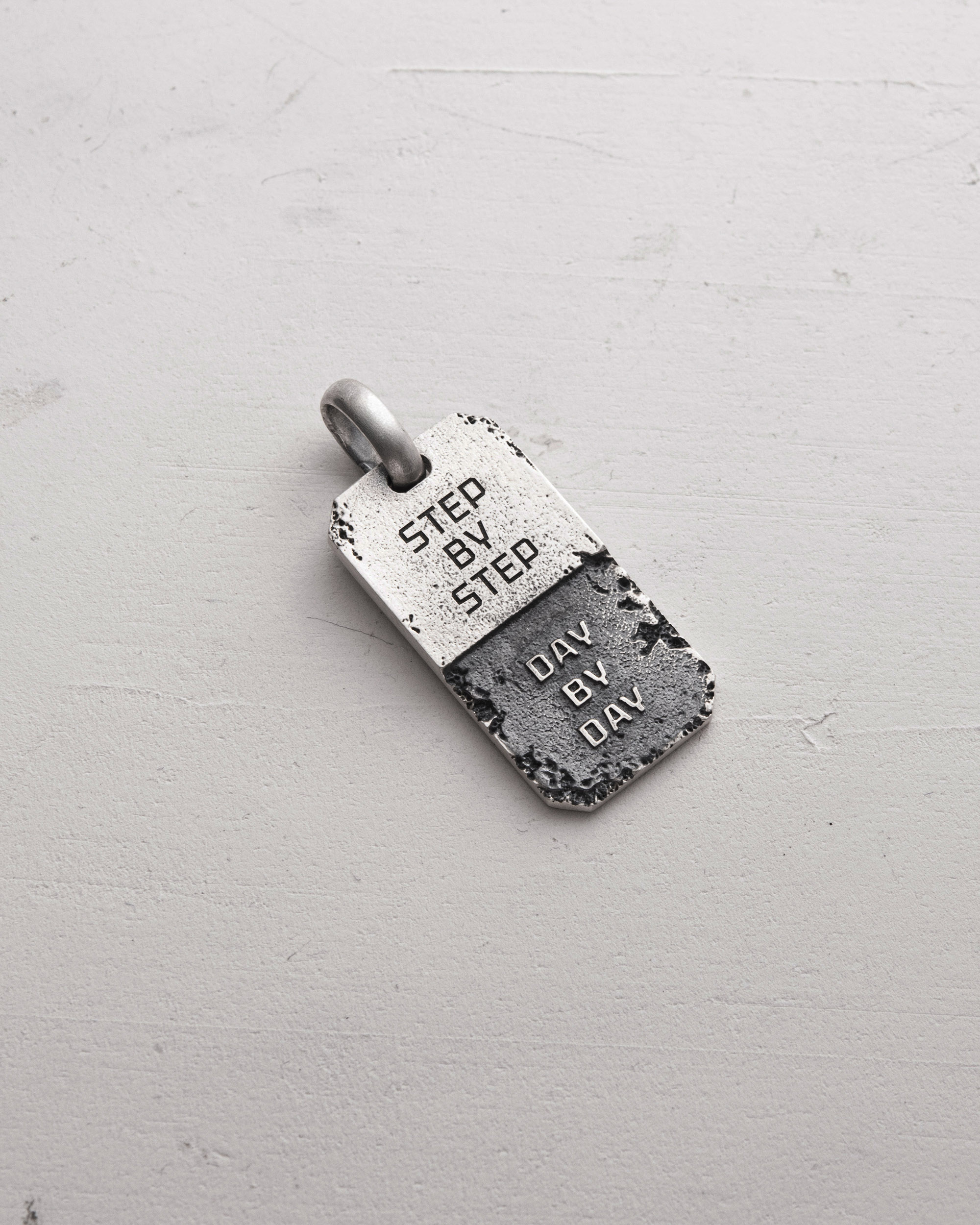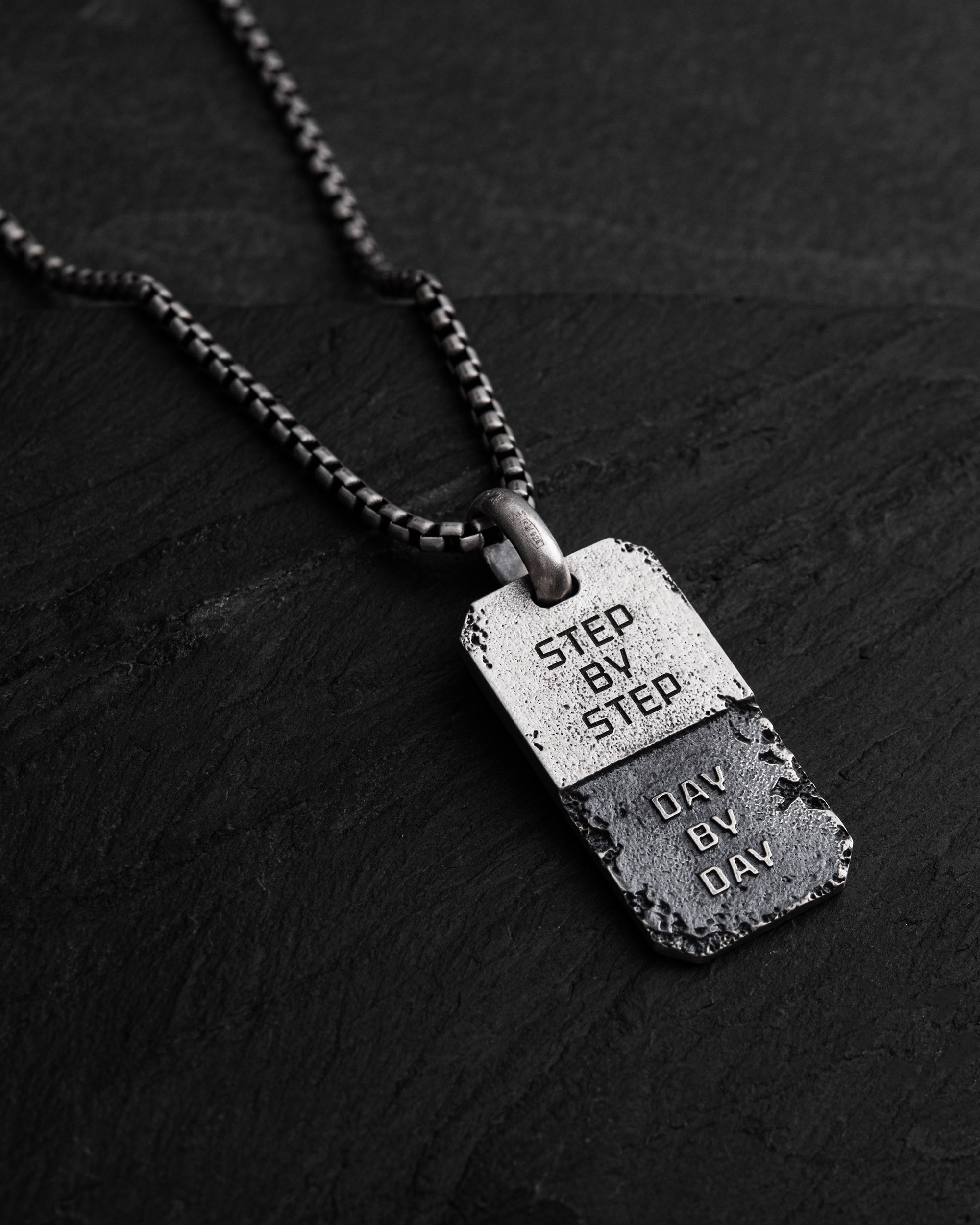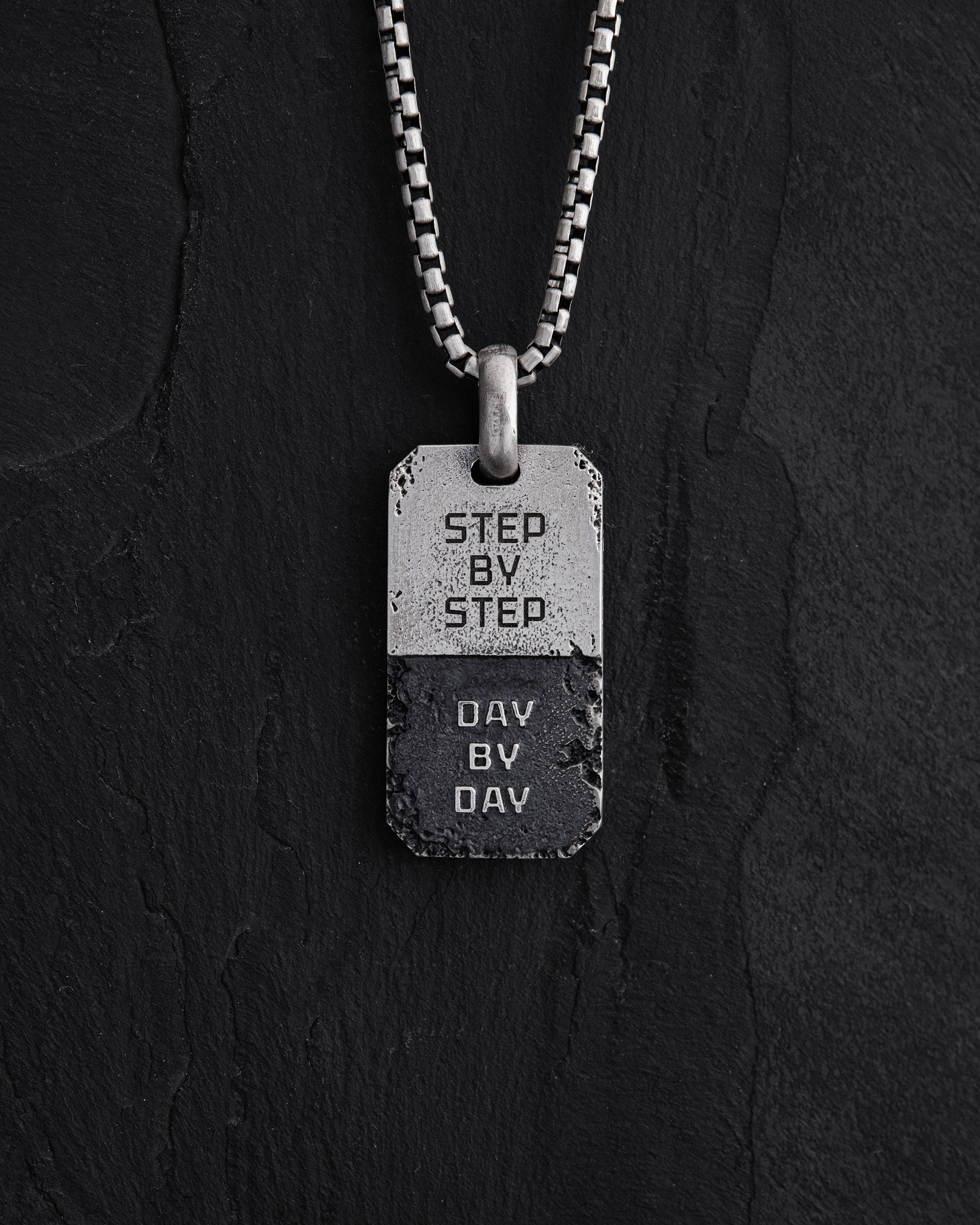 Der Silberanhänger STEP BY STEP steht für einen Weg, der durch Ausdauer entsteht, nicht durch Zufall. Die eingravierte Phrase “STEP BY STEP / DAY BY DAY” („Schritt für Schritt / Tag für Tag“) erinnert daran, dass wahre Ergebnisse nicht aus Glück entstehen, sondern aus stetiger, täglicher Arbeit.