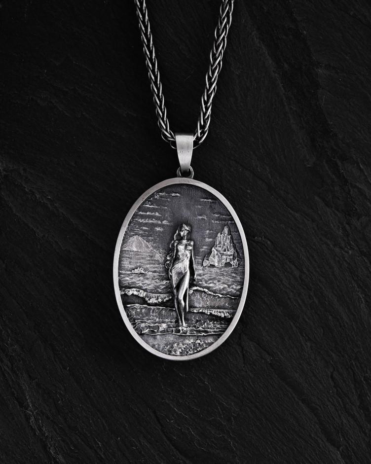 Der silberne Anhänger "SOMNIUM" ist ein elegantes Schmuckstück, das die tiefe Symbolik von Träumen und dem Streben nach neuen Horizonten verkörpert. Auf dem Anhänger ist eine Frau abgebildet, die aus dem Meer steigt, während im Hintergrund Felsen zu sehen sind. Die Frau symbolisiert die Verkörperung eines Traums – sie ist wie eine Schutzpatronin von Bestrebungen und Wünschen, die dazu inspiriert, innere und äußere Grenzen zu überwinden.