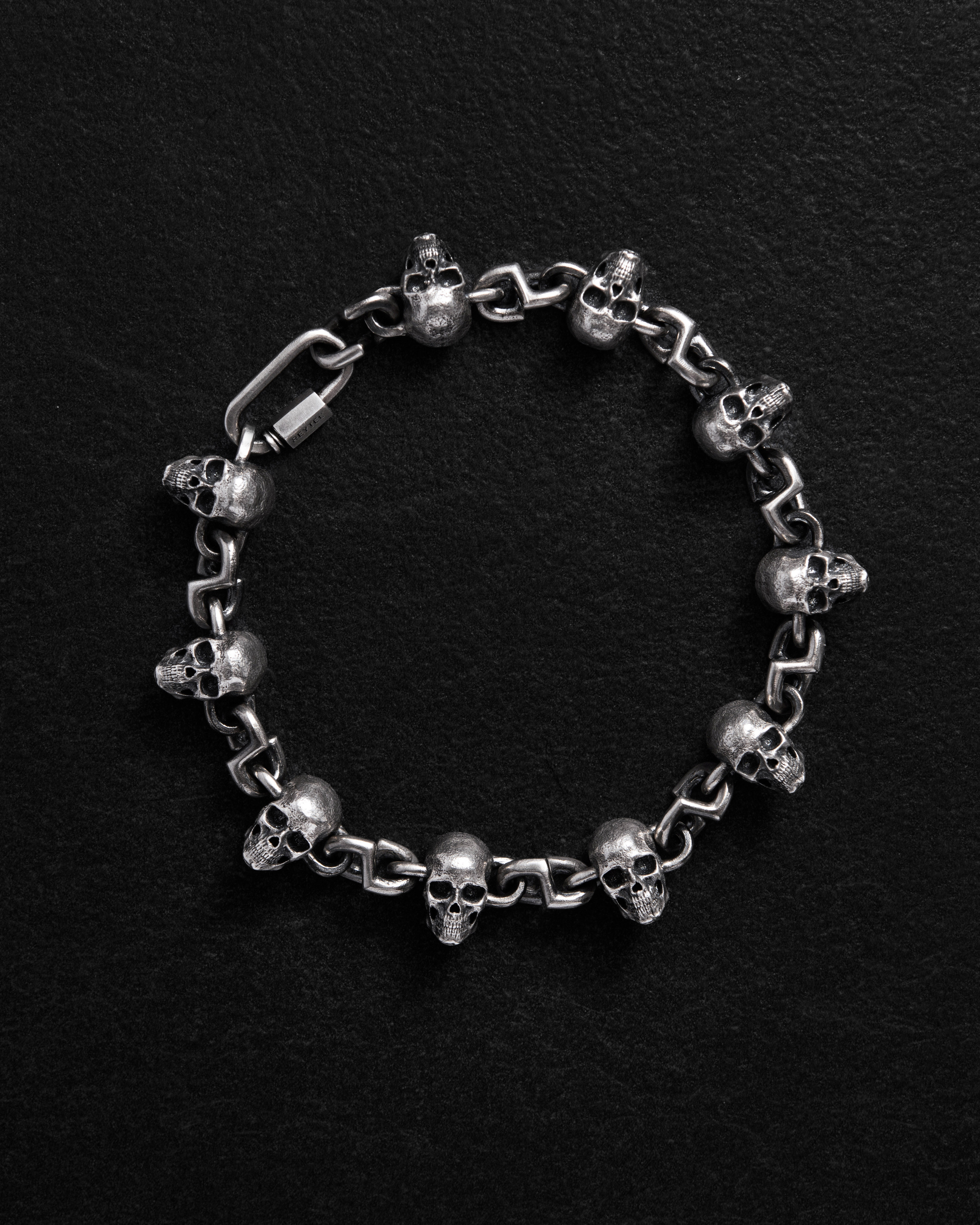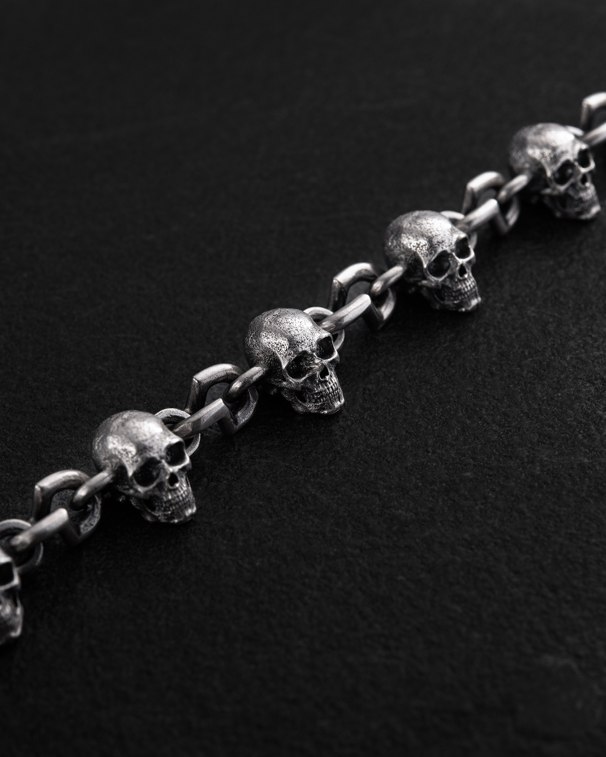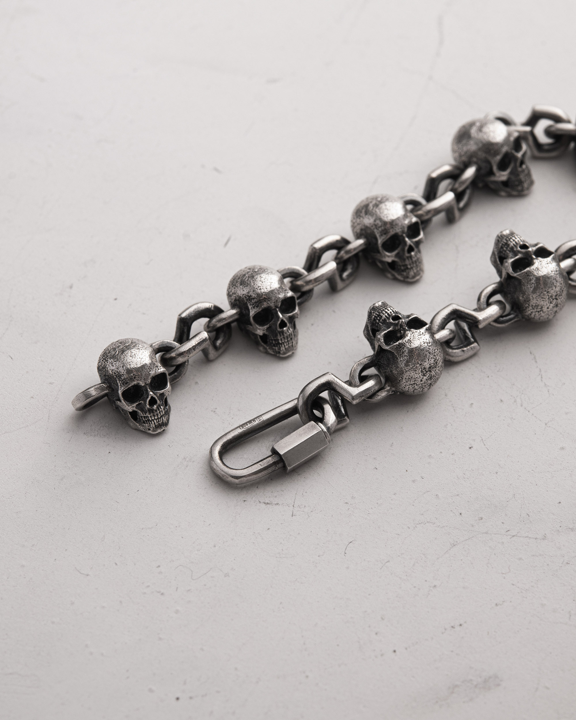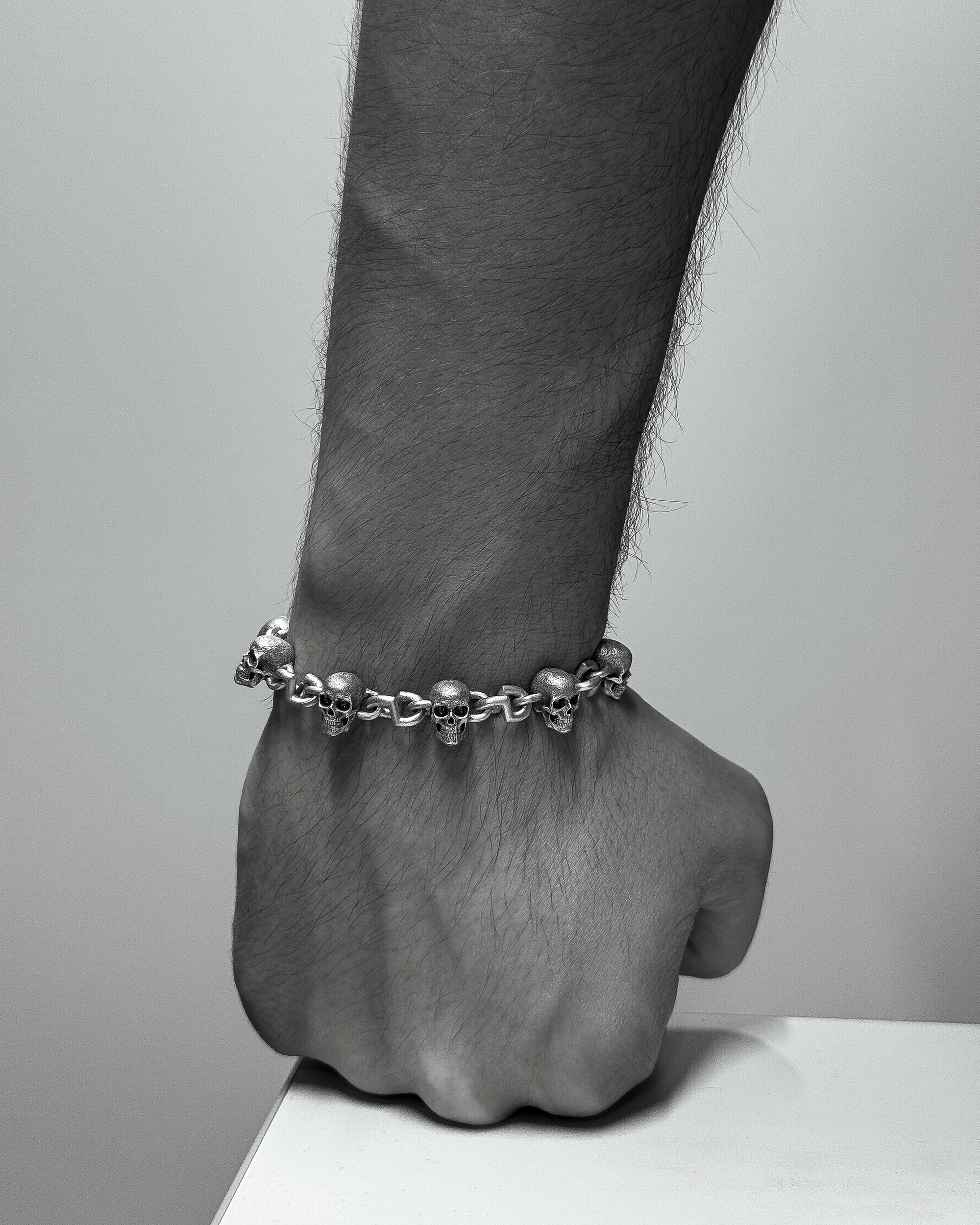 Die in die Kette eingearbeiteten Totenköpfe symbolisieren das Bewusstsein der Vergänglichkeit des Lebens — nicht als Angst, sondern als Erinnerung daran, dass die Zeit auf niemanden wartet. Sie fordern dazu auf, zu handeln, Träume nicht aufzuschieben, Herausforderungen anzunehmen und Spuren zu hinterlassen.