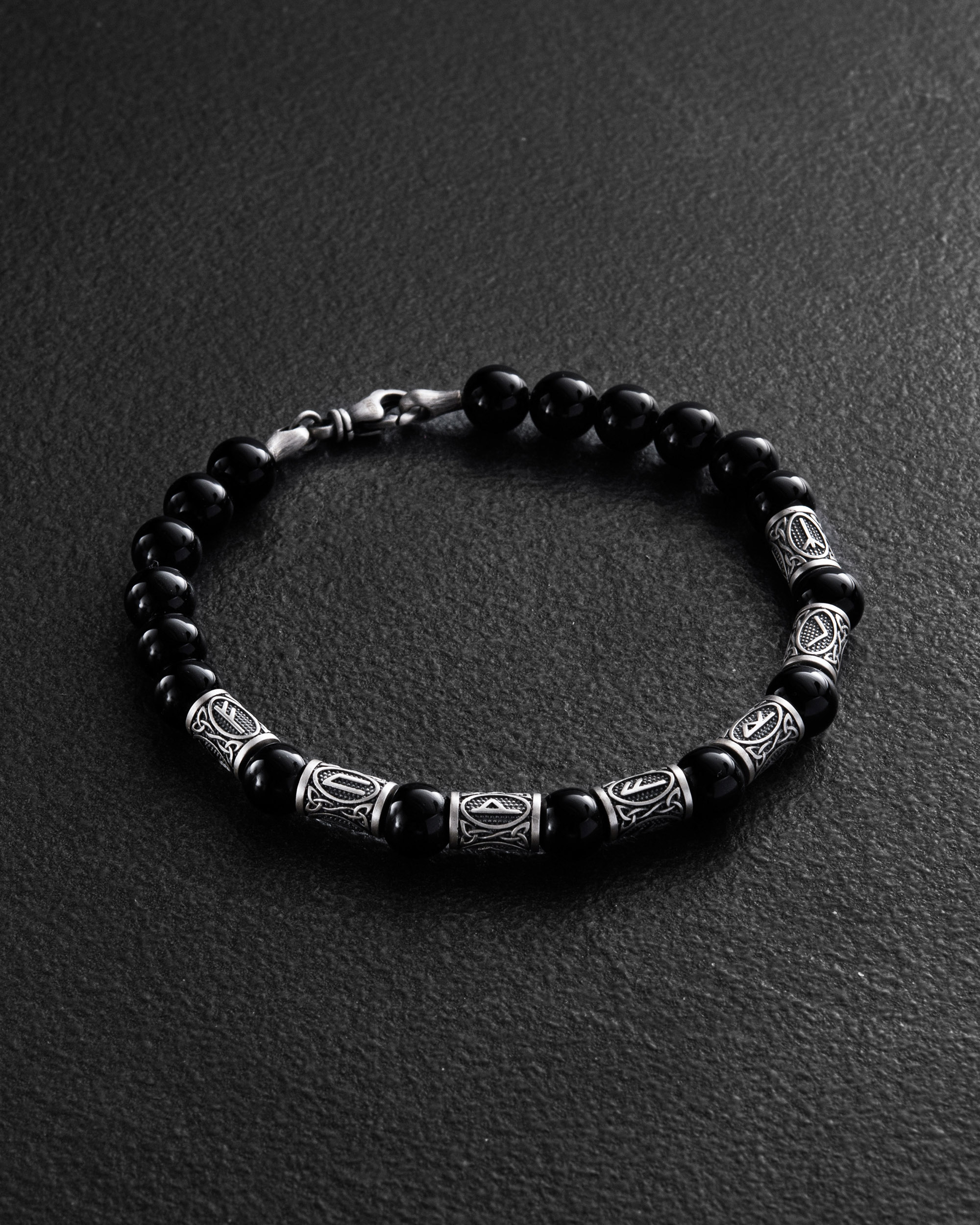 Silbernes Herrenarmband "RUNES" mit einer Kombination aus Onyx – ein einzigartiges Schmuckstück, das alte Symbole mit modernem Design verbindet. Jede Rune auf dem Armband trägt eine tiefgehende Bedeutung und bietet dem Träger Unterstützung, Schutz und Energie für persönliche Entwicklung: