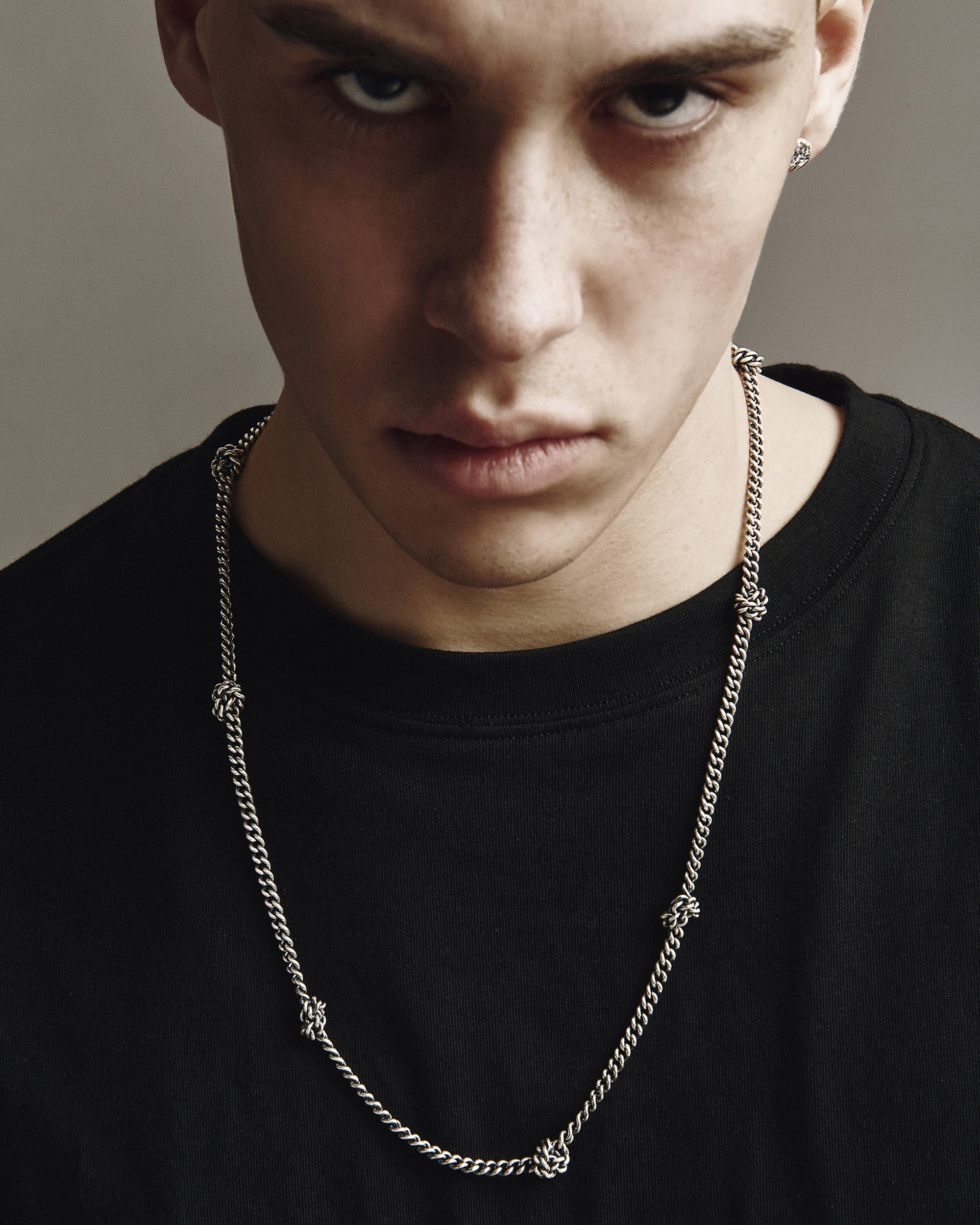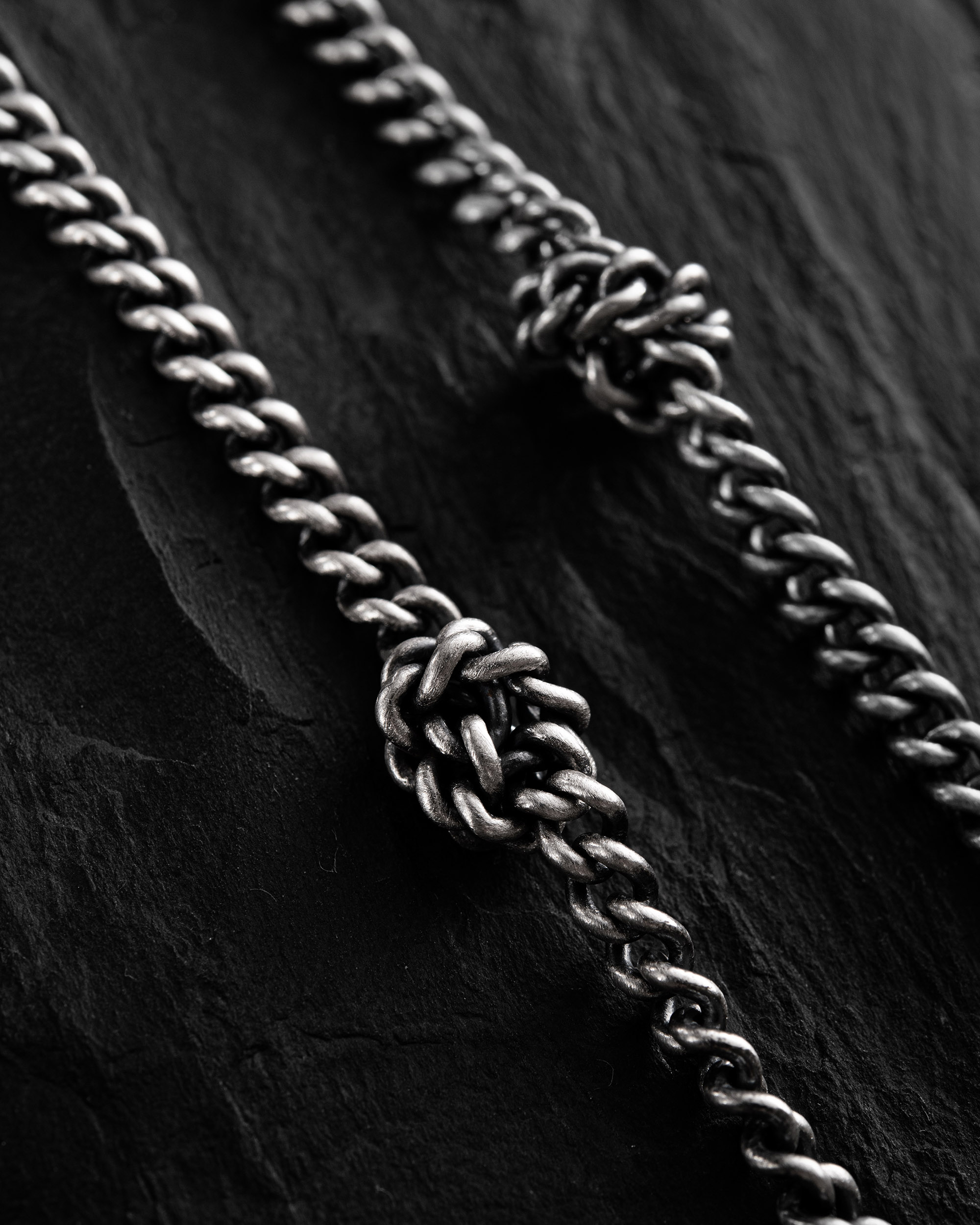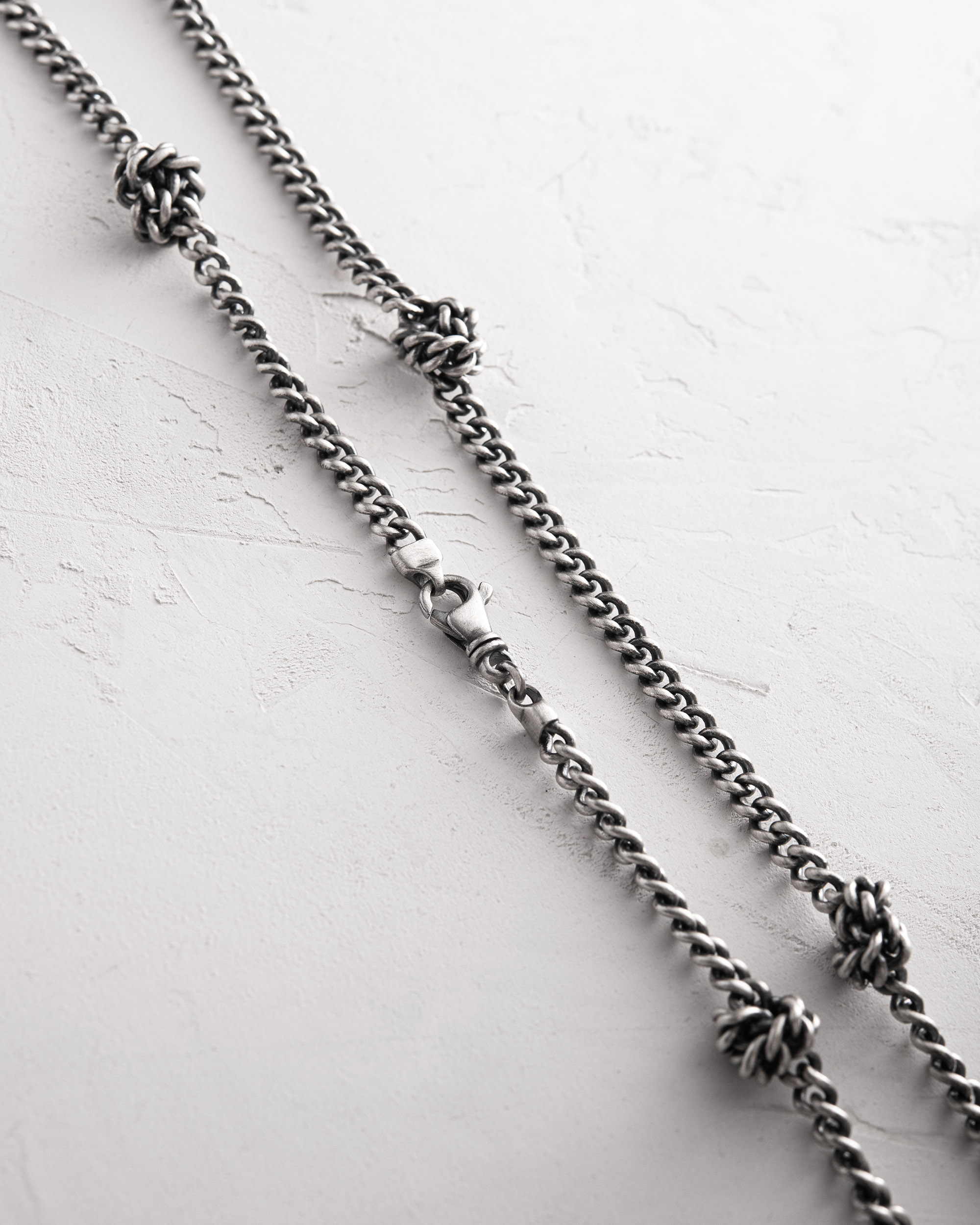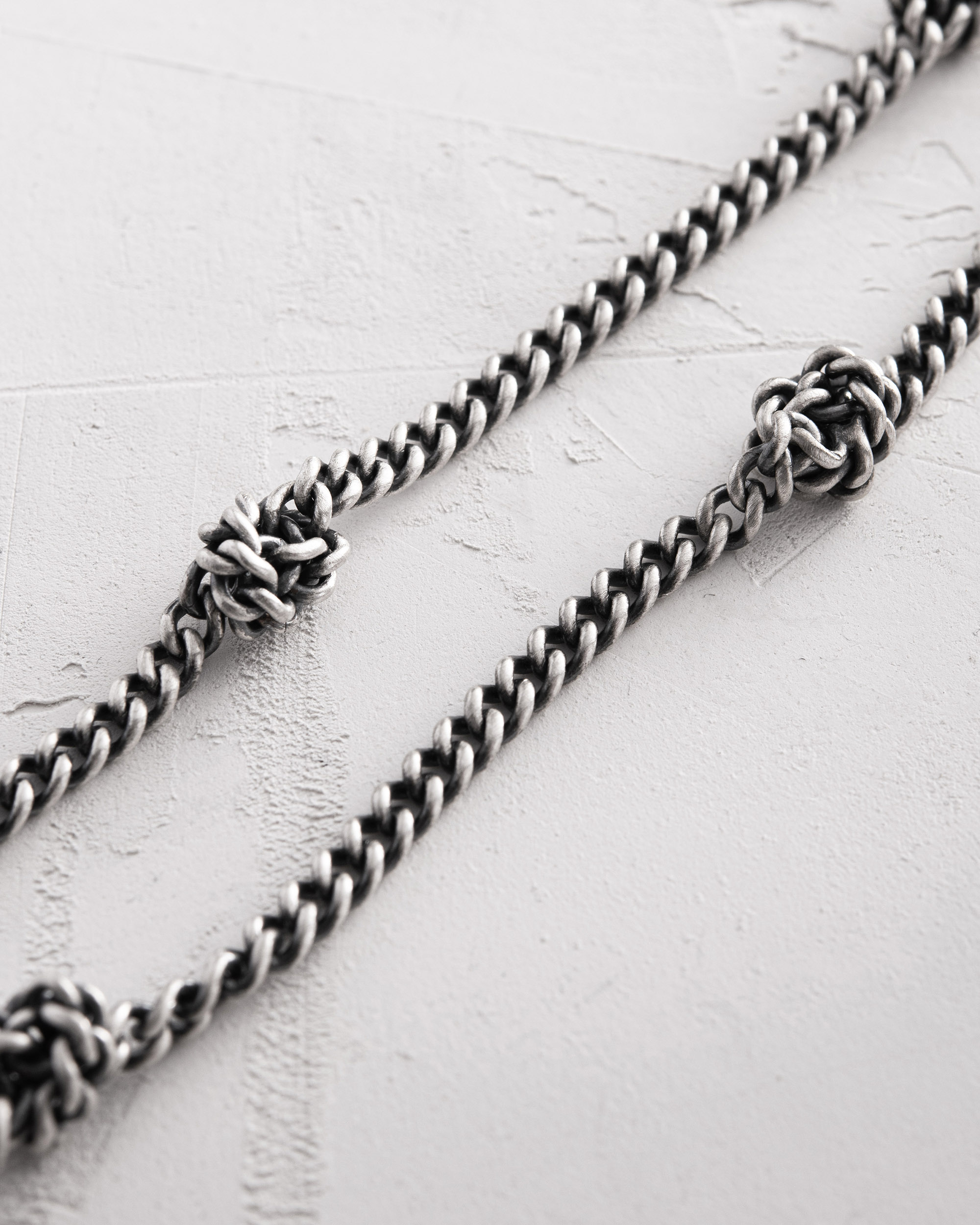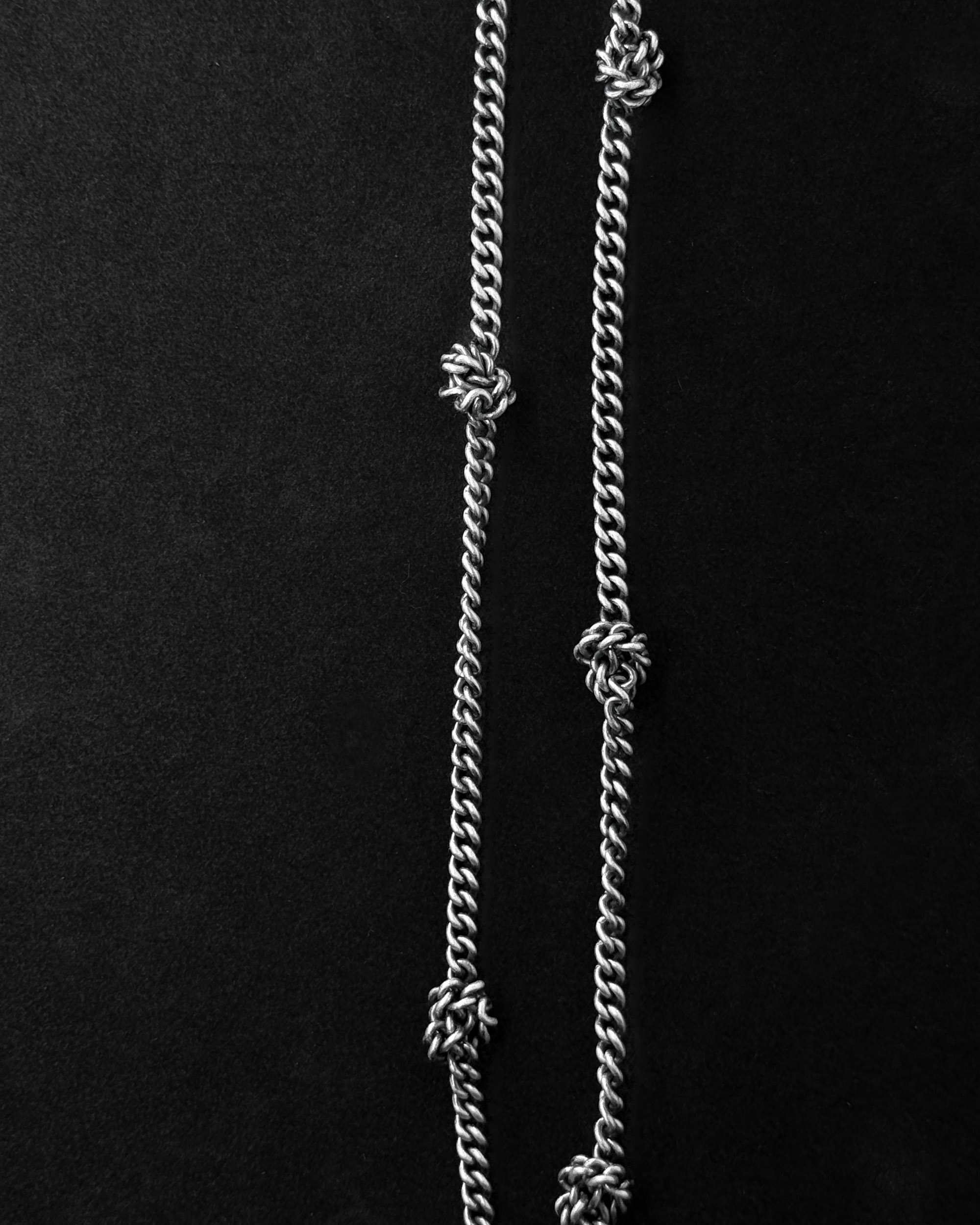 KNOTEN ist eine Silberkette, in der jeder Knoten die Beständigkeit von Prinzipien und Überzeugungen symbolisiert. In verschiedenen Kulturen steht der Knoten für innere Integrität und die Fähigkeit, am Wesentlichen festzuhalten, ohne sich selbst zu verlieren. Diese Kette erinnert an die stille Kraft von Überzeugungen und an das Vertrauen, das durch Erfahrung wächst. KNOTEN ist ein Schmuckstück für den Mann, der Wert auf Bedeutung legt und das trägt, was seinen Charakter ohne viele Worte widerspiegelt.