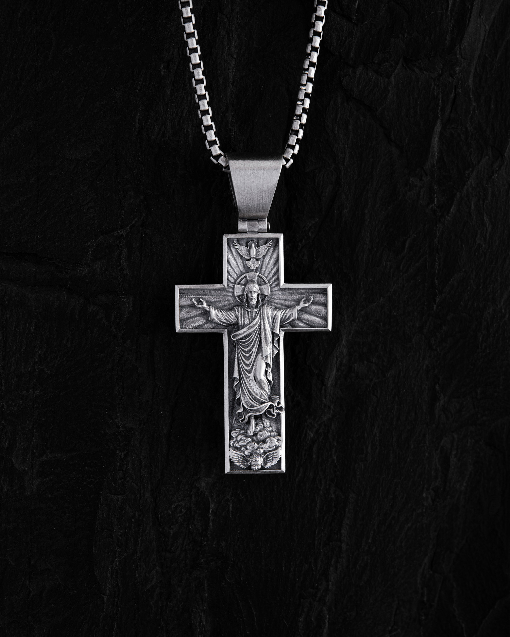 Silberkreuz AUFFAHRT JESU CHRISTI — zeigt den Moment der Himmelfahrt, ein Symbol für Glauben, spirituelle Erhebung und Hoffnung. Die Figur Christi mit ausgebreiteten Armen verkörpert Barmherzigkeit, Liebe und den Sieg des Lichts über die Dunkelheit. Die Strahlen und das Bild des Heiligen Geistes über dem Haupt betonen die Einheit des Himmlischen und Irdischen, während die feine Gravur dieses Stück zu einem sakralen Symbol und zugleich zu einem Kunstwerk macht. Das Kreuz erinnert daran: Der Glaube erhebt über alle Prüfungen.
