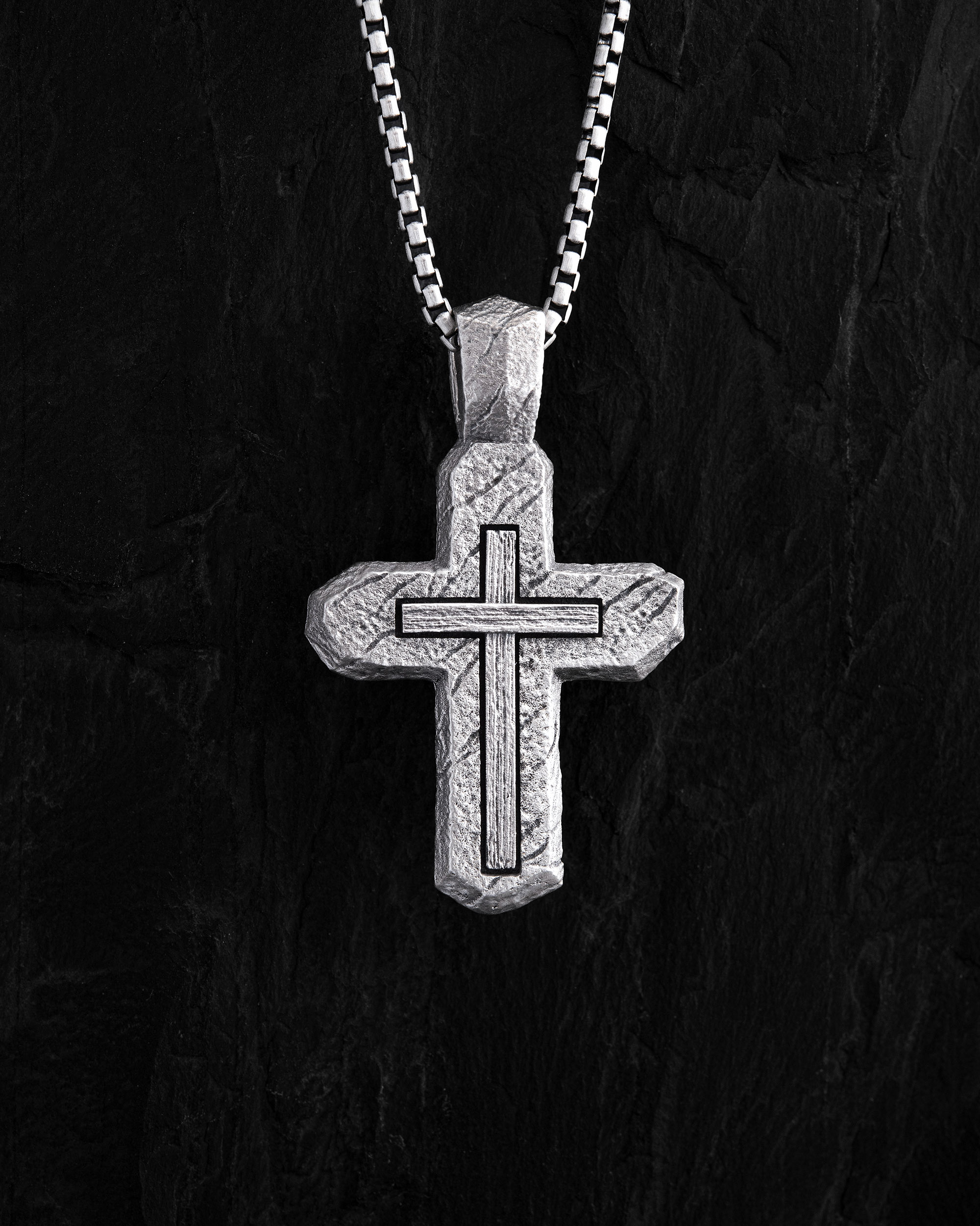 CALVARY CROSS. IN GOD WE TRUST ist ein Silberkreuz im massiven, strukturierten Stil, geschaffen für jene, die in Schmuck nicht nur Ästhetik, sondern auch spirituellen Halt suchen. Seine Form erinnert an behauenen Stein — ein Symbol des Glaubens, der Zeit und Prüfungen standhält. Die Gravur IN GOD WE TRUST („Wir vertrauen auf Gott”) auf der Rückseite dient als ruhige Erinnerung an das Vertrauen in eine höhere Kraft und an innere Stärke. CALVARY CROSS ist ein persönlicher Talisman für einen Mann, der Tradition, Bedeutung und seinen eigenen spirituellen Weg schätzt.