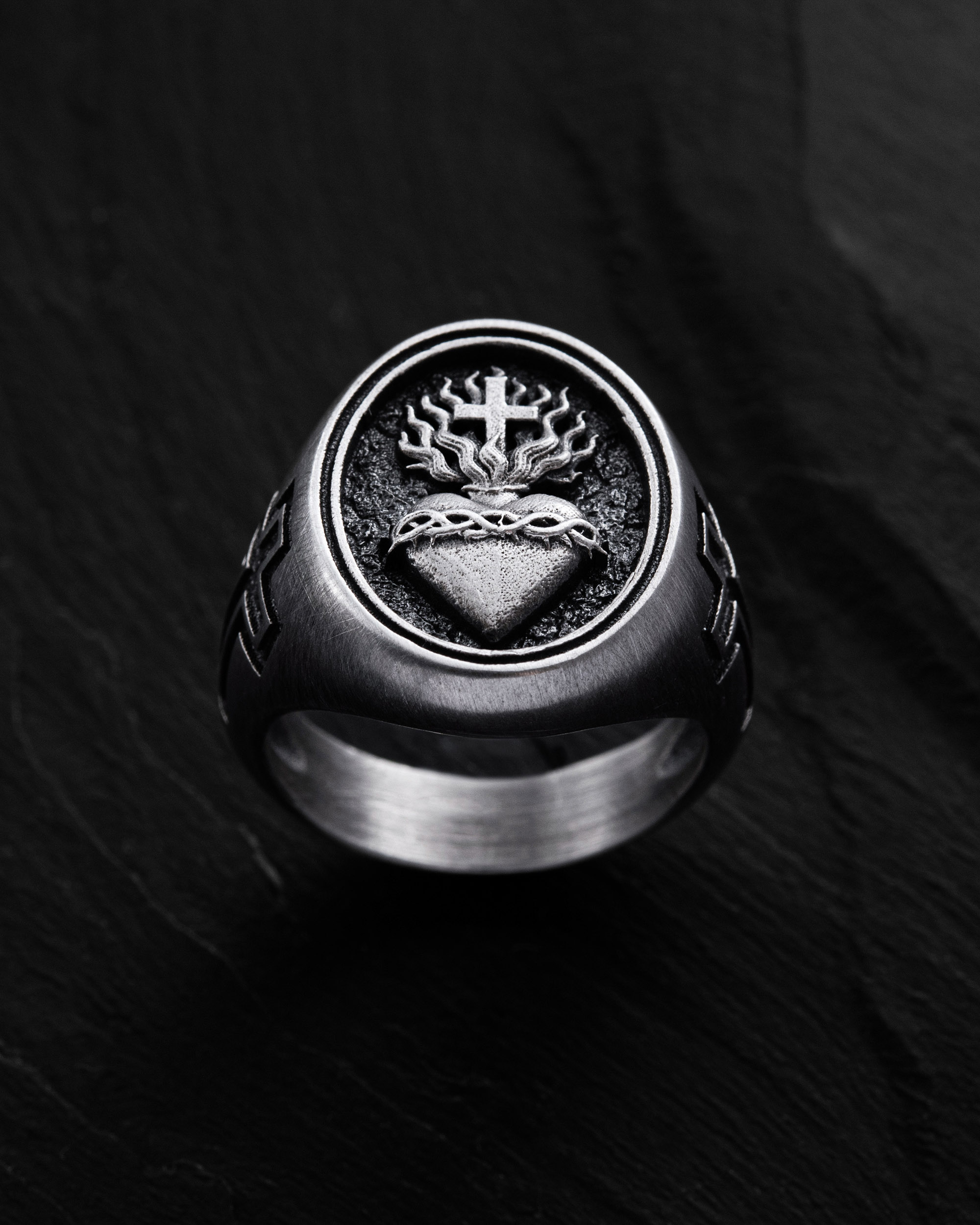 Der Herrenring SACRED HEART steht für Treue, Mitgefühl und geistiges Gleichgewicht. Er erinnert daran, dass wahre Stärke in einem Herzen liegt, das trotz allem lieben kann.