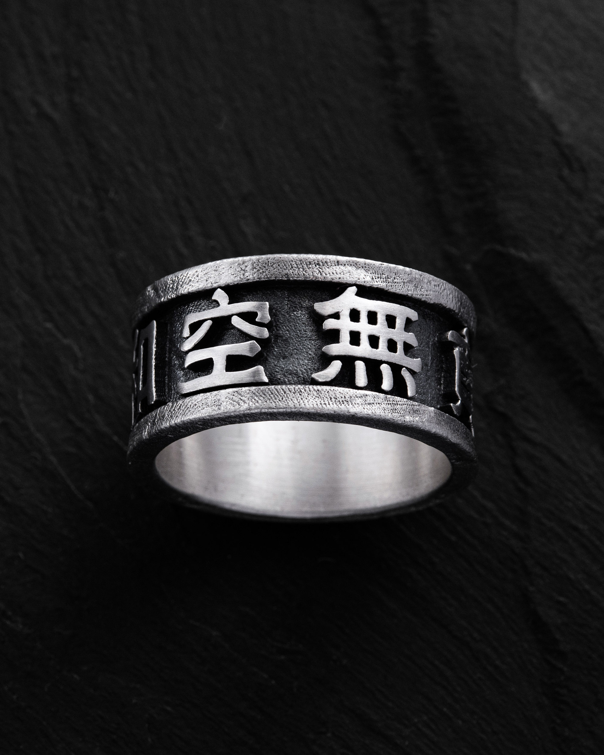 Die eingravierten Zeichen rund um den Ring spiegeln zentrale Konzepte der japanischen Philosophie wider: