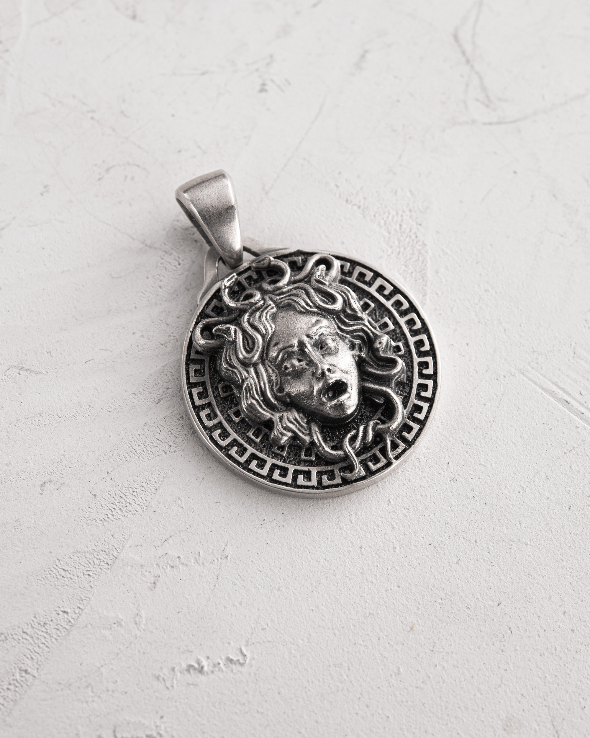 GORGON MEDUSA (aus dem Englischen — „Gorgone Medusa“) ist ein Silberanhänger, der die Kraft des Blicks, innere Stärke und die Dualität der Natur verkörpert.